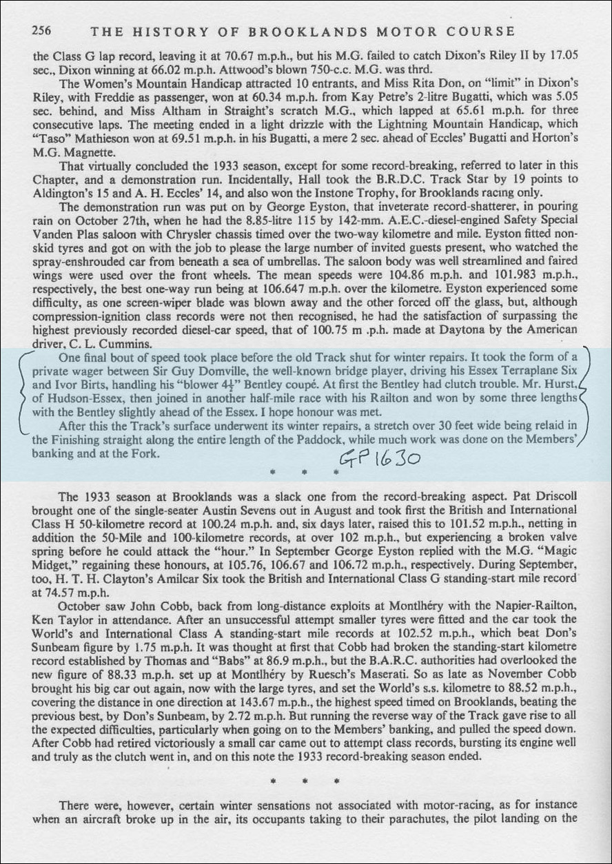 My father sold GP 1630 to the 7th owner P.J. Chatterly in 1953, P.J. Chatterly sold GP 1630 in 1966. It was left in a field for many years and the original Lancefield body rotted. Why, is any body's guess as it was still a valuable car.