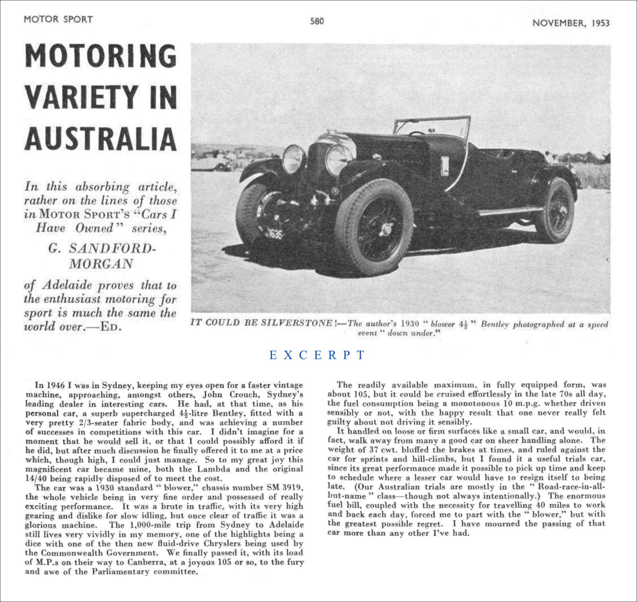 "In 1946 I was in Sydney, keeping my eyes open for a faster vintage machine, approaching, amongst others, John Crouch, Sydney's leading dealer in interesting cars. He had, at that time, as his personal car, a superb supercharged 4½-litre Bentley, fitted with a very pretty 2/3-seater fabric body, and was achieving a number of successes in competitions with this car. I didn't imagine for a moment that he would sell it, or that I could possibly afford it if he did, but after much discussion he finally offered it to me at a price which, though high, I could just manage. So to my great joy this magnificent car became mine, both the Lambda and the original 14/40 being rapidly disposed of to meet the cost.